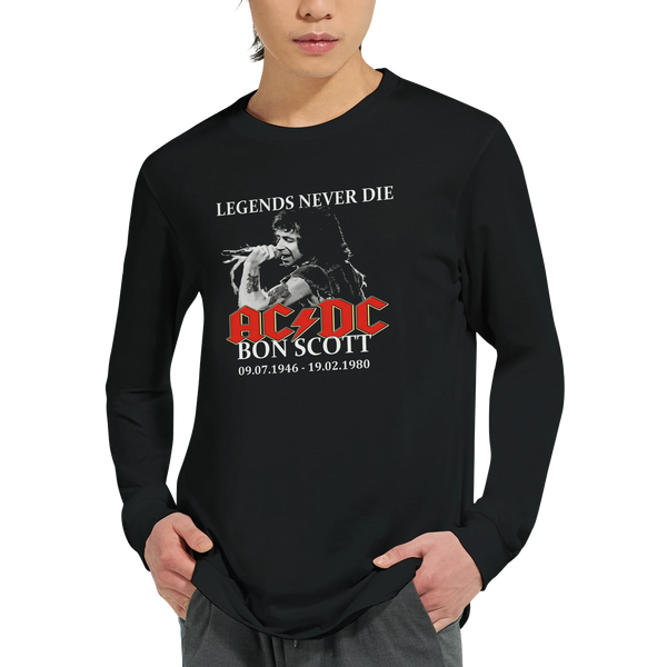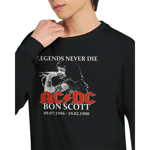 Celebrate the legacy of rock legend Bon Scott with our exclusive Legends Never Die Tribute T-Shirt. This soft long-sleeved crew neck shirt combines comfort and style, making it a must-have for music enthusiasts and fans alike.