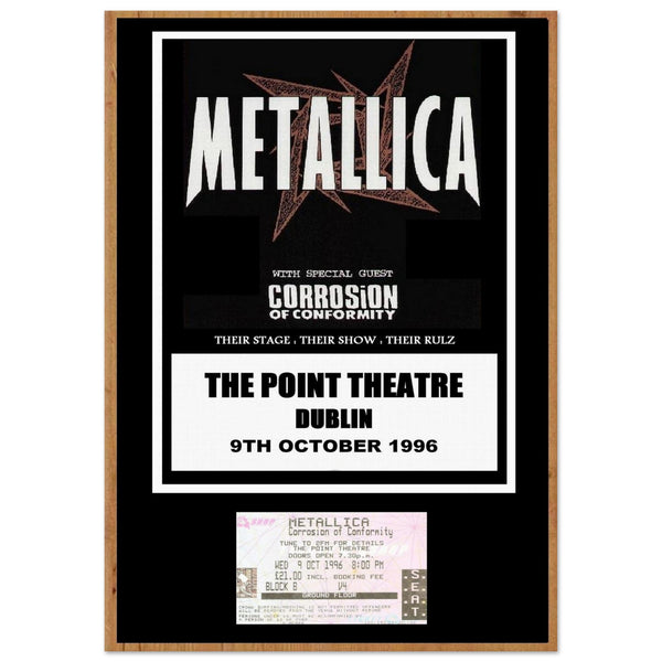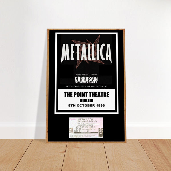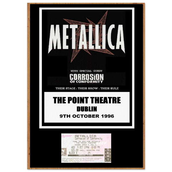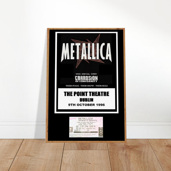 Celebrate the legendary Metallica performance at the Point Theatre in Dublin, 1996, with this exclusive concert poster. Featuring a striking design that incorporates a superimposed concert ticket, this poster is a must-have for any metal music fan or collector.